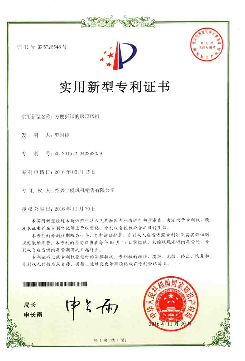 防火風(fēng)機(jī)專利證書(shū) 方便拆卸的房頂風(fēng)機(jī)專利證書(shū) 離心風(fēng)機(jī)葉片及輪轂專利證書(shū) 離心風(fēng)機(jī)專利證書(shū)